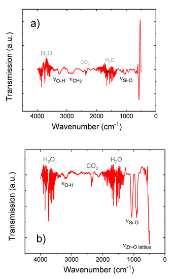 Figure 11a,b shows FTIR spectra taken for samples calcinated at both 400 °C and 600 °C, respectively. Both spectra show noisy absorption modes at 3400–4000 cm−1 and 1300–2000 cm−1 ascribed to remaining water adsorbed inside the porous film, in line with the O-H stretching mode at 3250 cm−1. Furthermore, both spectra show typical asymmetric CO2 stretching modes at 2362 and 2335 cm−1 caused by minor gaseous CO2 inside the FTIR spectrometer. In case of the sample calcinated at 400 °C (Figure 11a), another absorption peak can be observed in the range of 2710–3010 cm−1 which is ascribed to CH2 bending caused by remaining organic content inside the film. This peak is no longer visible for the sample calcinated at 600 °C, indicating the total removal of any organic content from the film. Figure 11b also shows absorption peaks at 1060 and 920 cm−1. This could be ascribed to C-O stretching in C-C-O and Zn-O-C moieties [2,6,7], yet it is more likely that these features are due to the oxidation of the Si substrate upon heating. This effect becomes more obvious for the sample heated to 600 °C (Figure 11b), showing clear Si-O stretching modes at 1070 and 910 cm−1 [2]. In case of the 600 °C sample, the onset of the characteristic Zn-O stretching mode for crystalline ZnO can be observed below 600 cm−1 [2]. Unfortunately, the utilized spectrometer does not cover the regime around 400 cm−1, where the Zn-O stretching mode is centered [2].