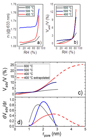 Applying Equations (5) and (7) to the refractive index variation with RH (Figure 12a), the volume fraction of all pores filled with condensate as a function of the maximum radius of these pores was calculated. Hence, Figure 12c can be interpreted as the cumulative distribution of open pores with respect to the pore radius. Therefore, its derivative yields the according PSD (Figure 12d). Due to limitations in the experimental setup, the RH could not be increased beyond 83%, restricting the detectable pore size to rpore < 2.8 nm (as it can be calculated from Equation (7)). Figure 12b shows the volume fraction of all pores that are filled with condensate at a specific RH.