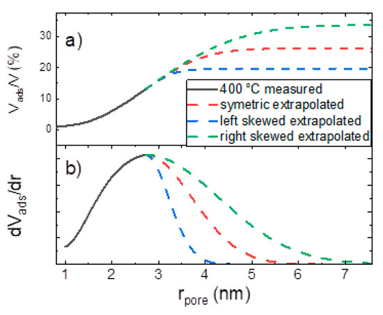 The curves of the volume fraction of pores obtained at 400 °C were extrapolated for pore radii bigger than 2.8 nm (RH > 83 %). The measured PSD for the 400 °C sample clearly shows its peak for pores with a radius of 2.8 nm. The PSD for radii > 2.8 nm was assumed to follow a gaussian behavior (dashed red line in Figure 12d). The fast decay of the extrapolated part of the PSD was chosen in order not to overestimate the contribution of bigger pores. This approach was justified by the fact that comparable PSDs show a symmetric or right-skewed behavior, therefore ours is rather an underestimation. The real PSD for the 400 °C sample will most likely have a higher contribution for bigger pores than the extrapolated PSD, meaning that the total porosity is likely to be higher than 25%. This approach also allows the extrapolation of the cumulative distribution (dashed red line in Figure 12c), simply by integrating the (not normalized) extrapolated part of the PSD.