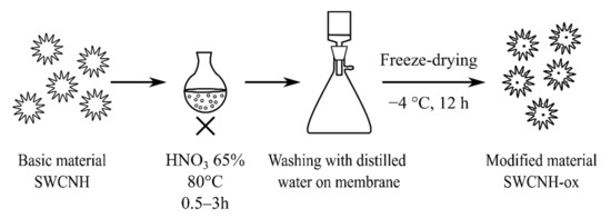 SWCNHs (NEC, Minato, Japan) were oxidized as it was previously reported [4] by 65% nitric acid at 80 °C for different times marked as SWCNH-ox-y (where y = 0.5, 1, 1.5, and 3 h), were washed, and were freeze-dried (Figure 1). The samples were characterized by thermogravimetry (in N2, heating rate 10 °C/min, three repetitions, Netzsch, Jupiter STA 449 F5) and ζ potential (25 °C, Particulate Systems, NanoPlus HD, Micromeritics, Norcross, GA, USA) at different pH levels (0.01 mg/mL solution in deionized water with an ionic strength 0.1 M using HCl, NaOH, and nKCl—all analytical grade, Chempur, Piekary Śląskie, Poland) as an extension of previously presented results [4]. The ζ-potential studies for the initial SWCNHs were impossible to perform due to the lack of dispersion in water. Additionally, the transmission electron microscopy (TEM) (FEI, Tecnai F20X-Twin, Particulate Systems, Norcross, GA, USA) images of all samples were prepared to obtain deeper insight into the observed changes caused by oxidation.