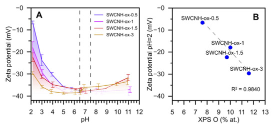 The results of ζ-potential analysis as a pH function at 25 °C (A). Figure (B) shows the correlation between ζ-potential at pH = 2 and XPS-determined oxygen content. Determination coefficient was calculated for three samples (single-walled carbon nanohorn (SWCNH)-ox-0.5; 1; 3).