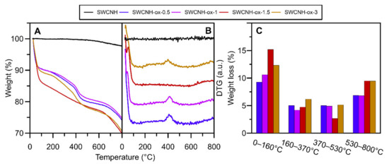 The thermogravimetric studies of carbon nanomaterials were performed to investigate thermal stability of the samples, but the profiles of the obtained curves also showed some information about the composition of the materials. As one can observe on the surface of initial SWCNH, the amount of oxygen functional groups is negligibly small and this is why the material is strongly hydrophobic, showing almost any changes on the thermogravimetric data determined in N2 atmosphere through all temperature range (Figure 3). The first decrease observed between 0–160 °C is responsible for the release of water captured by studied materials. The second peak (in the range of 160–370 °C) proves the presence of weekly acidic functional groups, mostly carboxyls [37,47] on the surface. The next range (370–530 °C) corresponds to groups such as lactones, anhydrides, as well as an amorphous carbon [38] covering the structures after oxidation. The last range between 530 and 800 °C represents desorption of the most temperature-resistant groups: anhydrides, lactones, phenols, carbonyls, quinones, and ethers [37,47]. It is important to note that lactones and anhydrides have different decomposition temperature ranges dependent of their location and chemical surrounding the surface of the sample. In specific conditions, they can rearrange to groups with higher thermal stability.