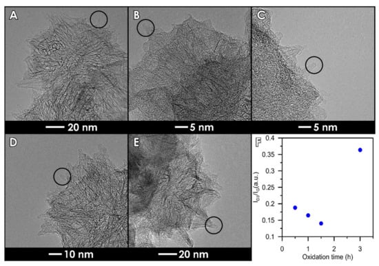 The complexity of the oxidation process is better shown on thermogravimetric curves (Figure 3), leading to the conclusion that SWCNH-ox materials can be divided into two groups due to the shape of the TG curves. The first group contains the samples possessing amorphous carbon residues on the surfaces (i.e., SWCNH-ox-0.5, SWCNH-ox-1, and SWCNH-ox-3); the second group (containing only one sample, i.e., SWCNH-ox-1.5) is the sample with mostly strong acidic group presence, and this structure is residues-free. It is clearly visible on TEM images presented on Figure 4. The circled regions point to the tips of the SWCNH (Figure 4B,C,E) where non-regular carbon impurities are visible, compared to its absence on Figure 4D. Also important is the core visibility in each sample. In the reference sample (Figure 4A), the cross section is clean and the internal structure of the agglomerate is clearly visible. A very similar situation occurs for the sample SWCNH-ox-1.5 (Figure 4D). However, for the samples SWCNH-ox-0.5, 1, and 3, the internal structure of the agglomerates is almost invisible. It is associated with the partial structure destruction during oxidation for samples SWCNH-ox-0.5 and -ox-1, leading to amorphous carbon creation and, further, additional burning-off of this residuals during longer oxidation (for 1.5 h).The longest oxidation time again leads to structure destruction (for the time = 3 h), which causes back appearance of amorphous carbon.
