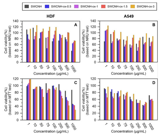 The results of in vitro experiments (A) Neutral Red Uptake (NRU) on human dermal fibroblasts (HDF), (B) NRU on A549, (C) 3-(4,5-dimethylthiazol-2-yl)-2,5-diphenyltetrazolium bromide (MTT) on HDF, and (D) MTT on A549 with SWCNH and SWCNH-ox materials.
