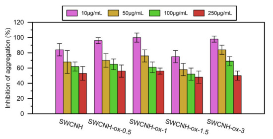 The results of the inhibition of platelet aggregation by SWCNH-ox materials in concentrations 10–250 µg/mL compared to the control (100%).