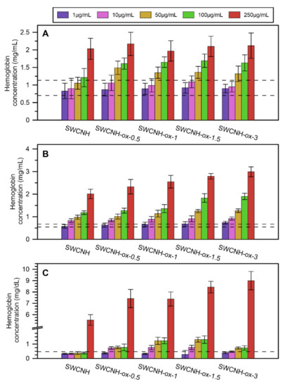 The results of hemolysis investigation by SWCNH-ox materials in different concentrations, 1–250 µg/mL, on (A) human blood, (B) porcine blood, and (C) erythrocyte suspension obtained from porcine blood. Dotted lines represent the range of data for the control.