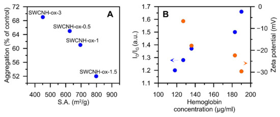 Correlation plots showing the dependence between (A) the aggregation of platelets and internal specific surface area [4] of SWCNH-ox materials and (B) the hemoglobin concentration from the hemolysis of porcine blood experiment and ID/IG ratio from Raman spectra [4] of SWCNH-ox materials. Data for the materials’ concentration at 100 µg/mL.