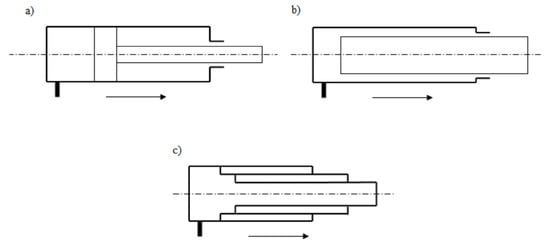 In a plunger actuator, there is the so-called plunger instead of the piston assembly. A telescopic actuator consists of a set of several pipes, extending one from the other—such an actuator allows obtaining large strokes.