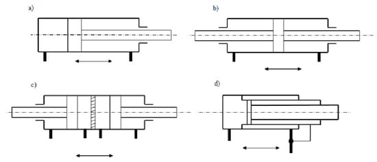 Types of double-acting actuators: (a) with one-sided piston rod, (b) two-sided piston rod, (c) multi-piston (double piston), (d) telescopic.