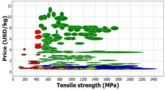 There are many tools for selecting materials. The optimum material is one that has the right values for the relevant parameters for the specific application. An interesting tool is the CES EduPack software, which allows analyzing materials and drawing material diagrams taking into account the values of various temperature, mechanical, and economic parameters. An example of such a material chart can be found in Figure 4. In this case, it is a graphical representation of different iron alloys in terms of selected parameters: tensile strength (horizontal axis) and price (vertical axis). In this case, stainless steel is marked in green and cast iron in red. Blue is responsible for low alloy steels and yellow for carbon steels. Each dot or oval represents a different material.