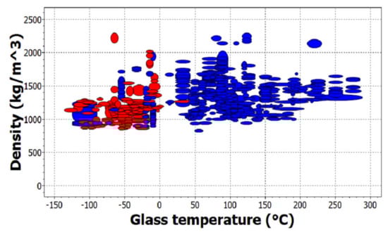 In Figure 5, there is another graphical representation of materials. The chart shows polymers in terms of density and glass temperature. Elastomers are marked in red and thermoplastic polymers are marked in blue.
