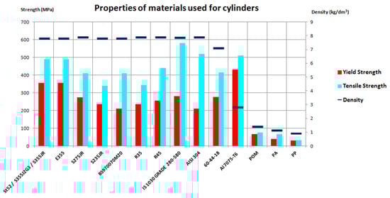 In the next part, the analysis of materials used for selected parts of hydraulic cylinders was performed. Material groups such as iron alloys, light metal alloys, composites, and polymers are discussed. For each of the discussed materials, the most important mechanical properties are presented, such as tensile strength, yield strength, hardness, impact energy, or elongation at break.
