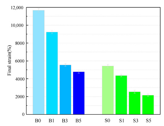 Considered in terms of resistance to plastic deformation, good high-temperature performance of asphalt binder can be interpreted as a small plastic deformation of the binder under the same loading conditions. Alternatively, under the same conditions and strains, the binder has a high strain recovery capacity. The magnitude of the likelihood of rutting in asphalt pavements under high-temperature action is reflected by these two points. After the MSCR test at 60 °C, the final strain of samples is shown in Figure 2 and Table 6. The total strain of the S0 sample was 46.50% of that of the B0 sample, which means that the SBS asphalt binder has a better elastic recovery than the base asphalt and that it has a better resistance to plastic deformation. The trend in the figure shows that the overall plastic deformation of the asphalt binder decreases significantly with the increase in MMT content, with the strain values of the B3 and S3 samples showing a significant decrease. Even the strains of B5 and S5 decreased by 49.03% and 46.12%. Thus, MMT significantly improves the ability of the asphalt binder to resist plastic deformation at 60 °C.