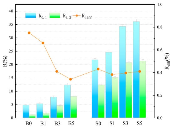 The average creep recovery and creep recovery difference ratios of the samples at 0.1 kPa and 3.2 kPa stress levels are shown in Figure 3 and Table 6. The smallest value of elastic recovery was found for the B0 sample, with an R-value of only 1.2% at 3.2 kPa, indicating the poor elastic recovery of the base asphalt at 60 °C. The SBS asphalt binder has a high R-value, which proves its superior performance in terms of elastic recovery. The SBS asphalt binder, on the other hand, possesses a high R-value, which also proves that its superior high-temperature performance contributes partially to the elastic recovery ability. In addition, it is evident that the R-value of the asphalt binder obtained a gradual increase with the increase of MMT doping. When the MMT admixture was 5 wt%, the R-values increased by 256.25% and 149.05% in the base asphalt and SBS asphalt binder, respectively, at a loading condition of 0.1 kPa. This fully illustrates that MMT has a significant contribution to the high-temperature elastic recovery of asphalt, and its intercalation structure plays a role in coordinating the force and deformation of the binder system. In addition, the larger the , the higher the sensitivity of the asphalt elastic recovery capacity to the heavy load effect. As can be seen from the figure, the elastic recovery rate differential ratio of the base asphalt is the largest, reaching 75%, while the of the asphalt decreases gradually with the addition of MMT, and even the B5 sample has been lower than the S0 sample. This indicates that in higher temperature environment, MMT reduces the sensitivity of asphalt creep recovery ability for heavy load action. Moreover, the addition of MMT to the SBB asphalt binder caused a slight decrease in the value of , implying a slight decrease in its elastic recovery capacity.
