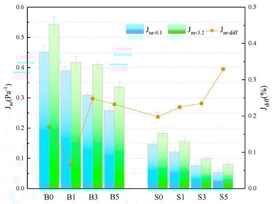 Jnr is the ratio of plastic strain to stress in asphalt during the creep cycle. The larger the Jnr under the same conditions, the lower the binder’s resistance to plastic deformation, meaning that a higher-temperature performance is worse; conversely, the higher-temperature performance of the binder is better. Jnr and are calculated as in Equations (3) and (4).
