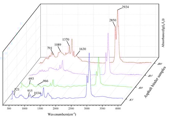 In the base asphalt, the absorption peaks at 2924 cm−1 and 2850 cm−1 are characteristic peaks for alkane C-H asymmetric and symmetric vibrations, respectively. The absorption peak at 1630 cm−1 characterizes the conjugated double bond C=C stretching vibration. Notably, 1370 cm−1 is a characteristic peak for aliphatic C-H in-plane bending vibration, while 1089 cm−1 represents the C-O stretching vibration. The characteristic peak of 791 cm−1 represents the olefin C-H out-of-plane bending vibration. For the SBS asphalt binder, there are some differences between the modified asphalt and the base asphalt in the fingerprint region located in the 650–1100 cm−1 region. The absorption intensities of the SBS asphalt binder are greater at 690–710 cm−1 and 950–980 cm−1, and absorption peaks appear at 966 cm−1 and 693 cm−1, which represent the out-of-plane C-H wobble vibrations on benzene rings and polybutadiene, respectively.