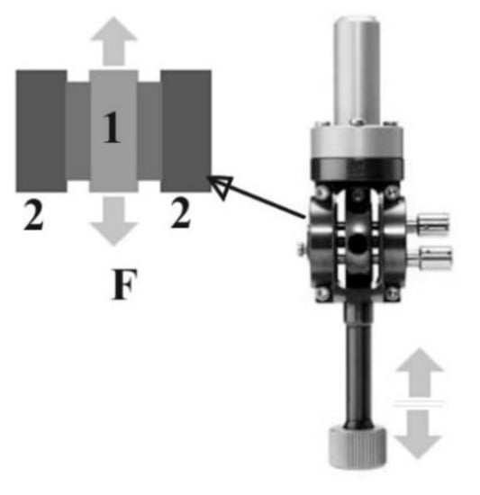 Configuration for shear operating mode in DMA/SDTA 861, STAR SYSTEM, produced by Mettler Toledo. 1-mobile plate, 2-fixed back support. F-shear force.