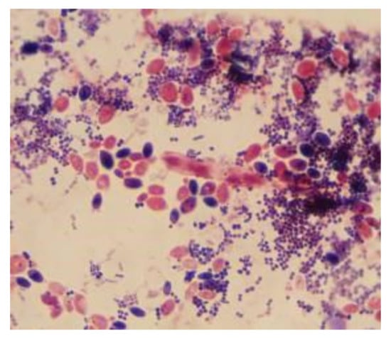 Microscopic images of Gram-stained smears performed directly from the biofilm developed on the surface of the voice prosthesis (Gram stain, ×1000).