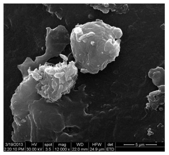 The microscopic examination of Gram-stained smears performed directly from the biofilm developed on the surface of the voice prosthesis revealed the presence of a frequent association between different morphological types, indicating the specific nature of microbial biofilm (Figure 6 and Figure 7). The examination of the colonized esophageal prosthesis specimens by scanning electron microscopy (SEM) revealed the presence of a mature biofilm, with a consistent matrix and a complex three-dimensional structure (Figure 8). The microscopic examination of different regions of the prosthetic device has shown that biofilm deposits are accumulating along the entire surface of the device. The well-developed biofilm could therefore be responsible for the prosthesis dysfunction and limited resistance over time.