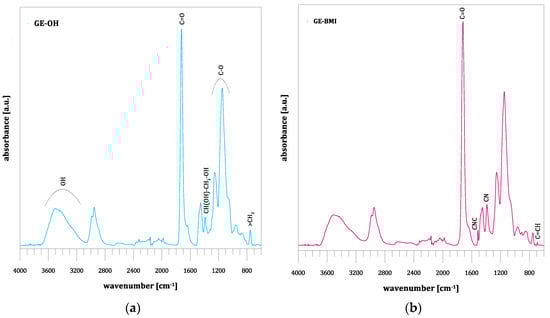 Figure 4a shows the spectrum of hydrolyzed GE microspheres. The bands at 905 cm−1 and 846 cm−1 characteristic of the epoxy ring disappear, which indicates that this group was completely converted into a hydroxyl one. In the spectrum, a wide band at 3800 to 3200 cm−1 corresponding to the vibrations of OH groups is visible. The increase in the intensity of the bands at 1430 to 1330 cm−1 can be attributed to the vibrations coming from the resulting fragment of the vic-diol -CH(OH)-CH2OH.