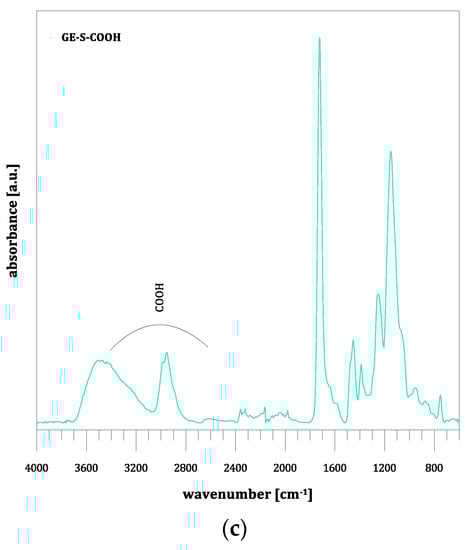 In Figure 4c, showing the FTIR spectrum of GE-S-COOH microspheres, the absorption band at 2580 cm−1 derived from the thiol stretching vibrations from 2-mercaptopropionic acid (2-MPA) is significant. This peak is not observed, which can be considered to correspond to covalent bond formation between the SH and C=C groups present on the surface of the microspheres. There was also a decrease in the intensity of the absorption bands at about 1630 cm−1 and 950 cm−1, characteristic of the vinyl groups. The appearance of a wide band ranging from 3400 cm−1 to 2400 cm−1 confirms the addition and presence of a characteristic carboxyl group derived from 2-MPA.