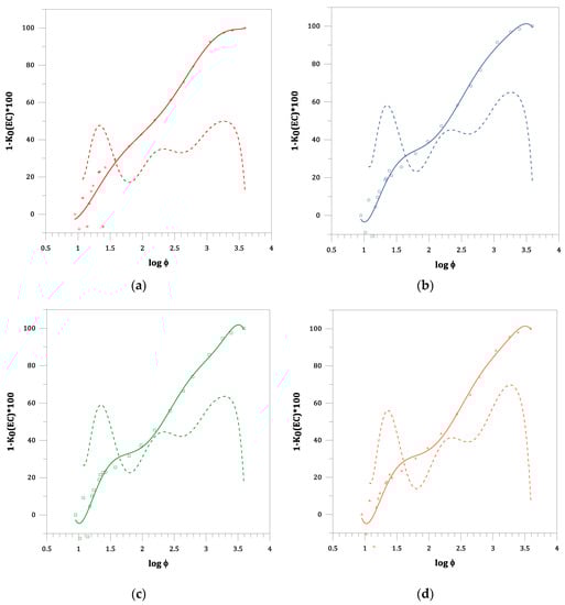 ISEC cumulative (―) and differential (‒ ‒) pore size distribution curves for the obtained copolymers: (a) GE; (b) GE-OH; (c) GE-COOH; (d) GE-S-COOH.