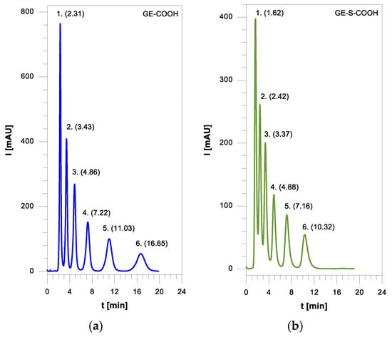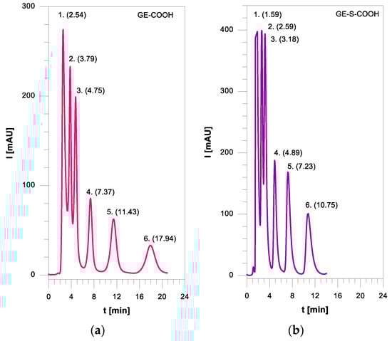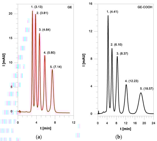 Separations of mixtures of the tested compounds on the functionalized phases were performed with the same mobile phase compositions. The exemplary separations are shown in Figure 7, Figure 8 and Figure 9. The separations of homologous alkyl aryl ketones on the polymeric phases with the carboxylic groups (GE-COOOH and GE-S-COOOH) are presented in Figure 7, whereas those of the mixture of polar N-anilines in Figure 8. Although the separation of anilines was incomplete for the initial components of the mixture, the peaks were symmetrical. On the phase with sulfur, the retention times of N-anilines were shorter. Nonpolar alkylbenzenes were well separated on both the starting GE stationary phase and that with the hydroxyl functional groups (Figure 9).