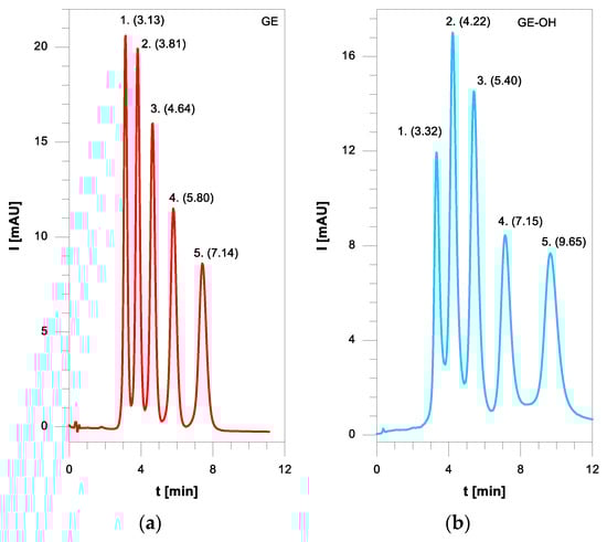 This method was adopted to evaluate the properties of more polar polymeric stationary phases [,]. Our current studies show that separation of the test mixtures on the obtained polar phases is possible with a much greater content of mobile phases than water phase. Short retention time and satisfactory separation were obtained on the starting GE stationary phase when the composition of the mobile phase was changed to contain 35% ACN or 40% methanol (Figure 6).