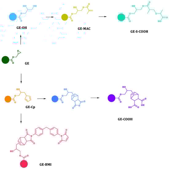 The oxirane groups in the material structure are highly reactive and undergo ring-opening reactions where hydrolysis allows the introduction of a diol moiety. The conjugated reactions firstly with sodium cyclopentadienide and then the Diels-Alder with maleic anhydride result in a carboxylic acid part being obtained. The analogous DA click reaction with 4,4′-bis(maleimido)diphenylmethane made it possible to introduce maleimide groups on the surface. A vic-diol fragment is an ideal starting point for modification due to the reaction with methacryloyl chloride. The vinyl bonds introduced in this way were then reacted with 2-mercaptopropionic acid by the thiol-Michael addition click reaction, through which carboxylic acid and thioether groups are obtained.