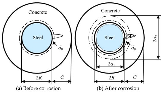 At the interface between the reinforced bar and concrete, the emanation of the initial defect is mainly attributed to the concrete settlement [22]. In this work, for these initial defects, a semi-elliptical crack existed in a thick-walled cylinder is adopted for modeling such an initial defect [32,33]. Additionally, in order to ensure the accuracy of relative analysis, the effects caused by these initial defects on the growth process of the corrosion-induced crack are also considered. In detail, Figure 1 shows an idealized section of a concrete cylinder with an initial defect which is assumed to be a three-dimensional semi-ellipsoid and can be simplified for plane problems. Specifically, in Figure 1, c denotes the half length of the semi-elliptical crack; a denotes the radial depth of the initial defect through the concrete cover; R denotes the inner steel radius; C denotes the concrete cover depth; the angle β is utilized to describe the position around the semi-elliptical crack varies between 0 ≤ β ≤ π, and A and B denote the deepest points of the crack in vertical and horizontal directions, respectively.
