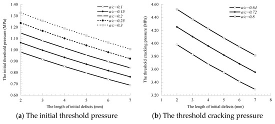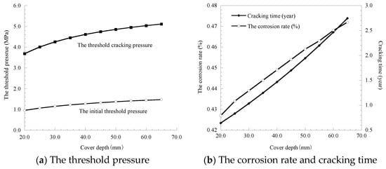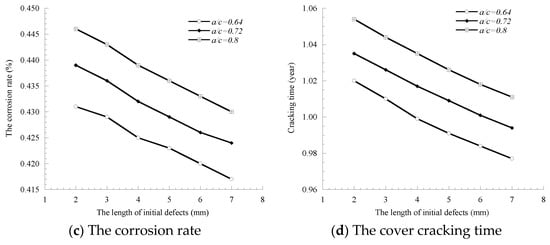 The initial defect length (a) is set to increase from 2 to 6 mm at 1 mm, and the corresponding initial defect size (a/c) is 0.1, 0.15, 0.2, 0.25, and 0.3, respectively. When the concrete cover cracks, the initial crack growth limits (a/c) are 0.64, 0.72 and 0.8. The calculation results of threshold pressure, corrosion rate of rebar and cover cracking time obtained by substituting the calculation parameters into the model are shown in Figure 3.