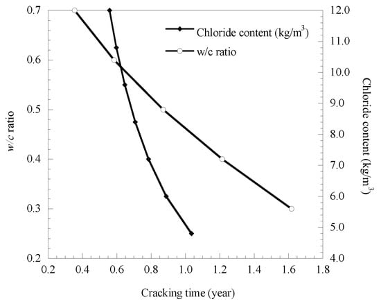 Past studies [3] have shown that concrete cover cracking time is closely related to cover depth, the diameter of steel reinforcement, the strength of concrete, concrete water–cement (w/c) ratio and other factors. Concrete w/c ratio has a great influence on concrete strength; the larger the concrete w/c ratio is, the lower the concrete strength is. In this paper, the concrete w/c ratio is selected as one of the main factors affecting cover cracking. Similarly, cover depth also has an important effect on cover cracking time; the thicker the cover, the longer it takes for the crack to reach the concrete surface, and the longer it takes for the corrosion products to fill the pores in the concrete [17]. Based on the Vu and Stewart model [27], the formula of impact factor is established, considering the influence of the w/c ratio and cover depth on cover cracking time and can be expressed as: