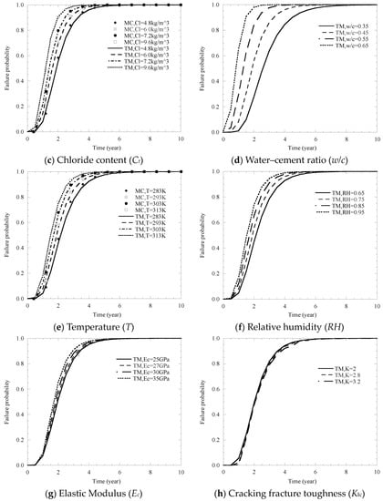 By adopting the value of various factors (C, d, T, RH, Ec, Cl, w/c, KIc) in Table 7, the corresponding failure probability of cover cracking influenced by their mean values of these factors are illustrated in Figure 9.