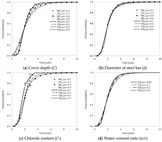 The comparison results of effects of cover depth, chloride content and temperature are summarized in Figure 9a,c,e. As indicated in these figures, the calculation results of the two methods are very close, which shows that the third-order method can calculate the influence of these three factors on the cover failure probability more accurately.