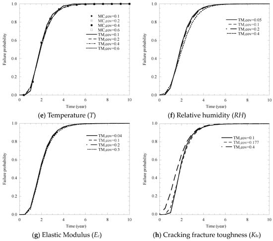 Due to the variation of the values for the above influencing factors, relative effects by coefficient of variation (COV) on the probability of cracking need to be examined. In detail, the relevant results are represented in Figure 10.