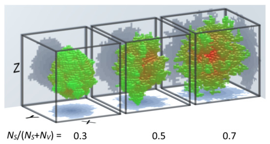 All simulated systems in this work were prepared based on the diffusion limited aggregation algorithm (DLA), described in detail in [24,25,26,27,28]. Basically, in this method, a single particle (seed) has been placed in the center of the system, and then the new particles are introduced into the system starting from the edges. The new particle moves randomly and, with some probability, it may stick to another stationary particle encountered in the system. Moreover, the algorithm was extended by a growing procedure (existing particles may extend to adjacent fields) similar to the grain growing procedure observed in the real systems. For example, the DLA can simulate chemical deposition, MBE deposition or rapid solidification from liquid state [29,30,31,32]. By controlling the attachment probability and the growth speed, it is possible to obtain the systems with a constant number of particles (7000), but with a different degree of the surface development, i.e., the ratio of the number of particles on the surface (NS) to the volume (NV), as was shown in Figure 1.