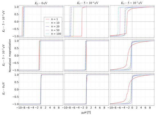 Simulated reverse magnetization curves for the systems with KS = 5 × 10−4 eV, KV = 0 eV and S = 0.2 as well as S = 0.5.