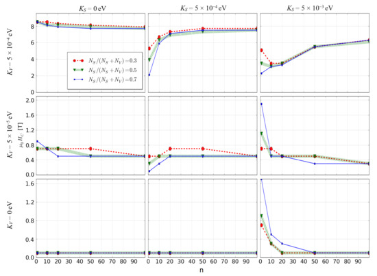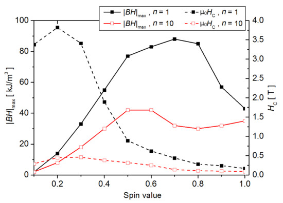 For both quantities, the presented curves reveal maxima at different spin values. In particular, for S = 0.7 and n = 1 the energy product |BH|max equals 85 kJ/m3, which is very promising considering that, for the best rare earths free permanent magnets (the ALNICO alloys), this parameter is about 30 kJ/m3. This means that a specific nanostructure with highly developed surface may fill the gap between conventional and rare earths-based permanent magnets. The open question is how to obtain such a structure and how to control magnetic moment of atoms in iron-based magnetic compounds. One can imagine applying rapid crystallization (flash annealing, mold suction casting, melt-spinning techniques, etc.) to control the microstructure as well as alloying addition (for example, some metaloids) to control magnetic moments attributed to Fe atoms.