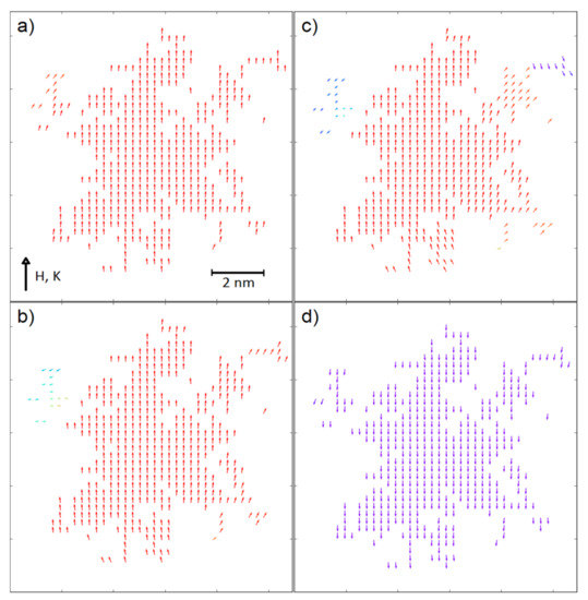 Spin configurations (cross-section) of the system presented in Figure 9 in the external magnetic field equal to (a) 1 T, (b) 0 T, (c) −0.4 T and (d) −0.6 T.