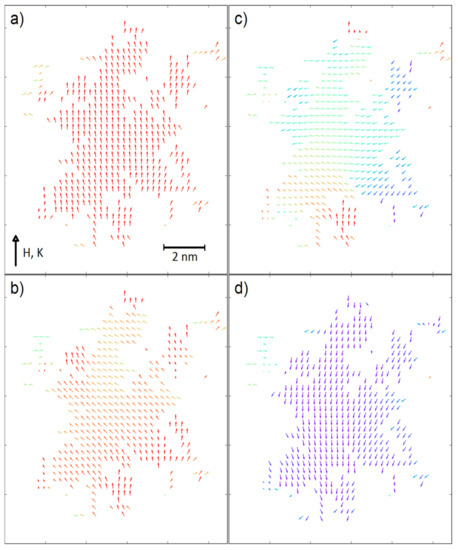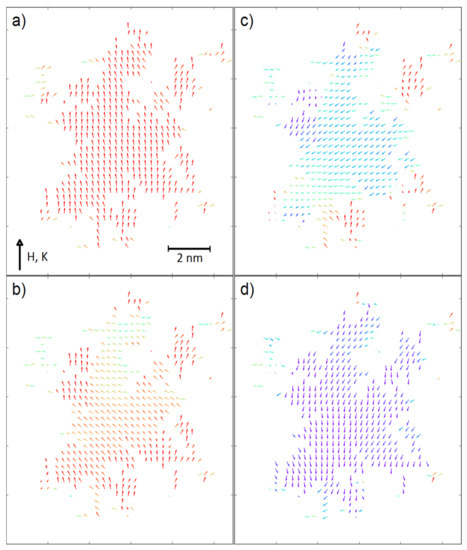 In a contrast to this, for the fractals with ultra-high coercivity (i.e., KV = 5 × 10−4 eV and KS = 5 × 10−4 eV) the increasing scaling factor results in the significant increase of coercive field, especially for the surface ratio equal to 0.7. An explanation of this behavior can be found in the recorded spin configurations. Figure 4 and Figure 5 depict magnetic moments of the nodes placed on a central plane (KV = 5 × 10−4 eV, KS = 5 × 10−4 eV and KV = 0, KS = 5 × 10−3 eV, respectively) of the analyzed 3D fractals for the surface ratio 0.7 and with the applied external magnetic fields around the coercive field. It should be emphasized that the surface anisotropy can play different roles dependently on the KV values. When the volume anisotropy is high, the magnetic moments of the developed surface can change their directions in lower external magnetic field due to different angles between the KS vector and the field H; e.g., some of the surface magnetic moments are nearly parallel to the field. If magnetic coupling between volume and surface is strong enough, the anisotropy field of the whole fractal decreases. Therefore, the reverse magnetization process is initialized on surface, as shown in Figure 4. Furthermore, enlargements of the fractals to mesoscopic size is attributed to a relative decrease of the NS/NV ratio, which obviously leads to reducing the meaning of the surface magnetic moments and the increase in HC is observed (see Figure 3, middle-top graph). Relatively high surface anisotropy can cause the completely opposite effect when the volume of the fractal is magnetically soft (see Figure 3, bottom-right graph). In this situation, only magnetic moments on the surface are a source of anisotropy and via exchange interactions they can influence magnetic moments in the volume. Indeed, Figure 5 depicts such a case in which the reverse magnetization process is initiated by the soft magnetic nodes in the volume of the fractal. The effect of interaction between the volume and the surface is clearly visible in Figure 5d when the spins are aligned not perfectly co-linear, as was observed for ultra-high coercive objects (see Figure 4d).
