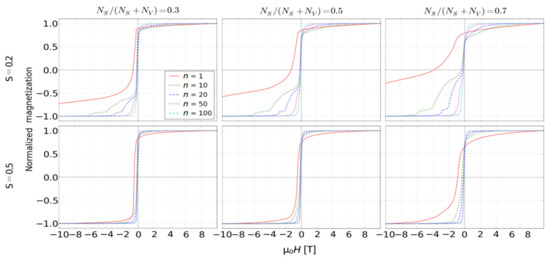 Reverse magnetization curves for all examined objects with NS/(NS + NV) = 0.7 and S = 1.