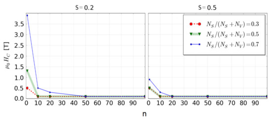 Analyzing the full variability of S, one can notice an increase of coercive field with decreasing S value. Possible applications as permanent magnets also require high values of the magnetic remanence and, consequently, the energy product |BH|max. Let us estimate the |BH|max values, taking density and magnetic induction as for α-Fe (i.e., induction in saturation equal to 2 T for S = 1). With this assumption, it is possible to plot dependencies of the S value on the coercive field and the estimated energy product, as shown in Figure 8 for n = 1 and n = 10.