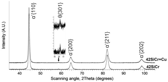XRD patterns of quenched 42SiCr and 42SiCr + Cu steels were found to be very similar (Figure 2). Diffraction peaks of α’ martensite were detected. A weak peak of θ cementite was found as well. No retained austenite (RA) was detected, which is in line with the relatively high martensite start (Ms) temperatures: 368.4 °C for 42SiCr steel and 338.6 °C for 42SiCr + Cu steel. The Ms temperatures were calculated using the following equation [18]: