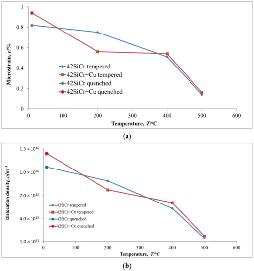 Microstrains (e) and dislocation density (ρ) of 42SiCr and 42SiCr + Cu steels after quenching and subsequent tempering, determined using XRD data in accordance with [11], are shown in Figure 3. Note that the found high value of the ρ in studied steels after quenching corresponds to the result [10] on the dependence of ρ on the silicon content. With an increase in the tempering temperature to 500 °C both e and ρ for 42SiCr and 42SiCr + Cu steels decreased significantly, i.e., almost by 7 and 6 times, respectively.