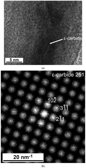 - Thompson, S.W. Structural characteristics of transition-iron-carbide precipitates formed during the first stage of tempering in 4340 steel. Mater. Charact. 2015, 106, 452–462. [Google Scholar] [CrossRef]