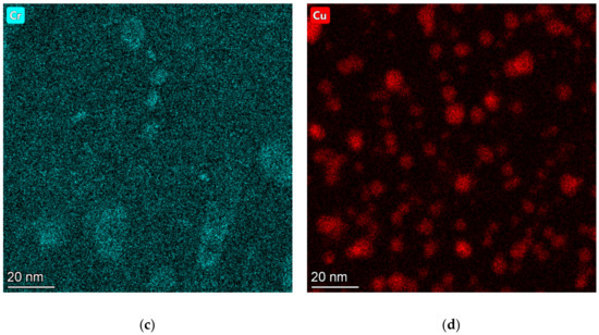 TEM-EDS map of chemical composition showing Cu-rich precipitates after tempering at 500 °C—(a) BF, (b) Fe map, (c) Cr map, (d) Cu map.