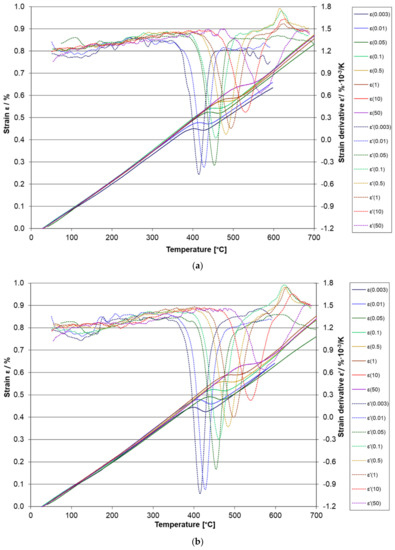 Thermal strain and its derivative for 42SiCr steel (a) and 42SiCr + Cu steel (b) tempered using heating rates β = 0.003 K/s, 0.01 K/s, 0.05 K/s, 0.1 K/s, 0.5 K/s, 1 K/s, 10 K/s, and 50 K/s.