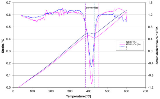 Two contractions are found in dilatometry heating curves for 42SiCr and 42SiCr + Cu steels (Figure 11). The temperatures for inflection points (Ti) of these steels and steels with low silicon and chromium levels [7,8] (Ti values for steels [7,8] were taken from Figure 3b in [8]) are presented in Table 2 and Table 3. The inflection point for the first tempering stage indicates the precipitation of ε-carbides, whereas the inflection point for the second tempering stage indicates the precipitation of cementite. A very significant effect of chemical composition was found by comparing the inflection points of cementite precipitation in the present steels and in the steels studied in [8]. Note that cementite precipitates in 42SiCr steel are between 381 °C and 432 °C and in 42SiCr + Cu steel are between 383 °C and 453 °C at a heating rate of 0.003 K/s (Figure 12). Therefore, cementite can be expected in specimens 742 and 842. Tempering peaks are larger for 42SiCr + Cu steel than for 42SiCr steel because a larger proportion of solute C atoms remain in the virgin martensite in 42SiCr + Cu steel, which might be caused by the suppressed auto-tempering during quenching [8]. The difference in peak size corresponds to the amount of strain induced by carbide precipitation. This value decreased with increasing heating rate from 0.5 K/s. Higher heating rates shift the inflection point of strain for stage II tempering to higher temperature and suppress stage I tempering. The activation energy E and frequency factor K0 calculated for 42SiCr and 42SiCr + Cu steels and steels in [7,8] using Equation (1) are presented in Table 4 and Table 5. It was found that E for cementite precipitation is very sensitive to the content of silicon and chromium. There is a weak dependence of E for ε-carbide precipitation on Si and Cr content in the studied steels and the steels studied in [7,8]. The frequency factor for cementite precipitation was not found to be highly sensitive to chemical composition of steels. However, when it comes to precipitation of ε-carbide in steels 42SiCr and 42SiCr + Cu, it is several orders of magnitude higher in comparison to steels [7,8].