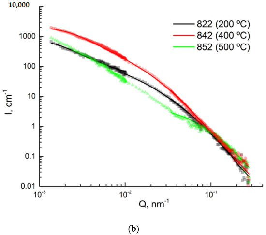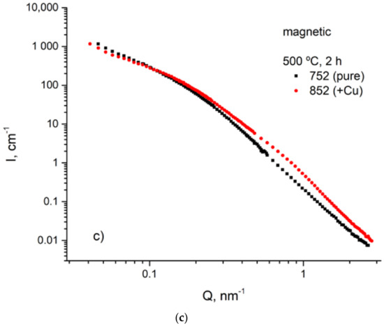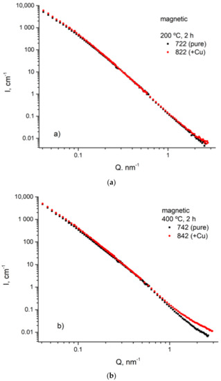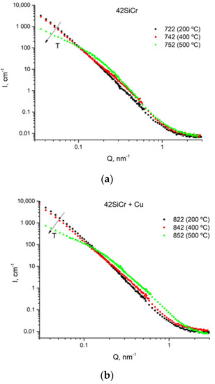 The ex situ-measured SANS scattering curves are plotted in Figure 14. At first glance, the SANS curves are similar within pairs of samples (722 and 822), (742 and 842), and (752 and 852) (Figure 14). In the region of small-magnitude scattering vectors (Q < 0.1 nm−1), the scattering intensity decreases with tempering temperature in samples of the steel without copper. An opposite trend which is seen in samples with copper tempered at 400 °C and 500 °C at larger Q magnitude may have been caused by the occurrence of copper precipitates, according to [8,20,21]. The evolution of copper precipitates was explored by comparing the SANS magnetic scattering for samples with and without Cu tempered at the same temperatures (see Figure 15). It was assumed that the difference in the levels of silicon and chromium in 42SiCr and 42SiCr + Cu steels did not significantly affect magnetic scattering.