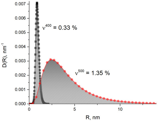 The differences in magnetic scattering for materials with and without Cu became apparent for higher tempering temperatures (400 °C and 500 °C). The curves were fitted using SASfit software [22]. Log-normal distributions of spherical particles were used for fitting the difference between the corresponding samples of 42SiCr and 42SiCr + Cu steels. The magnetic scattering contrast for the model was estimated by calculating the magnetic scattering length density (SLD) of iron, SLD = 5.1 · 1010 cm−2 because copper particles are fully nonmagnetic (SLD = 0). The fitted size distributions of spherical particles weighted by volume are shown in Figure 16. The integrals over the size distributions provide the total volume fractions of copper precipitates: v400 = 0.33% for the sample tempered at 400 °C (sample 842) and ν500 = 1.35% for 500 °C (sample 852), respectively. The resulting values may be slightly lower than the actual ones since they were close to the instrumental resolution limit, especially with sample 842. The mean radii of nanoparticles <R>V = 0.8 nm for sample 842 and <R>V = 4.1 nm for sample 852 were found from the fitted volume weighted size distributions (Table 7) [23].